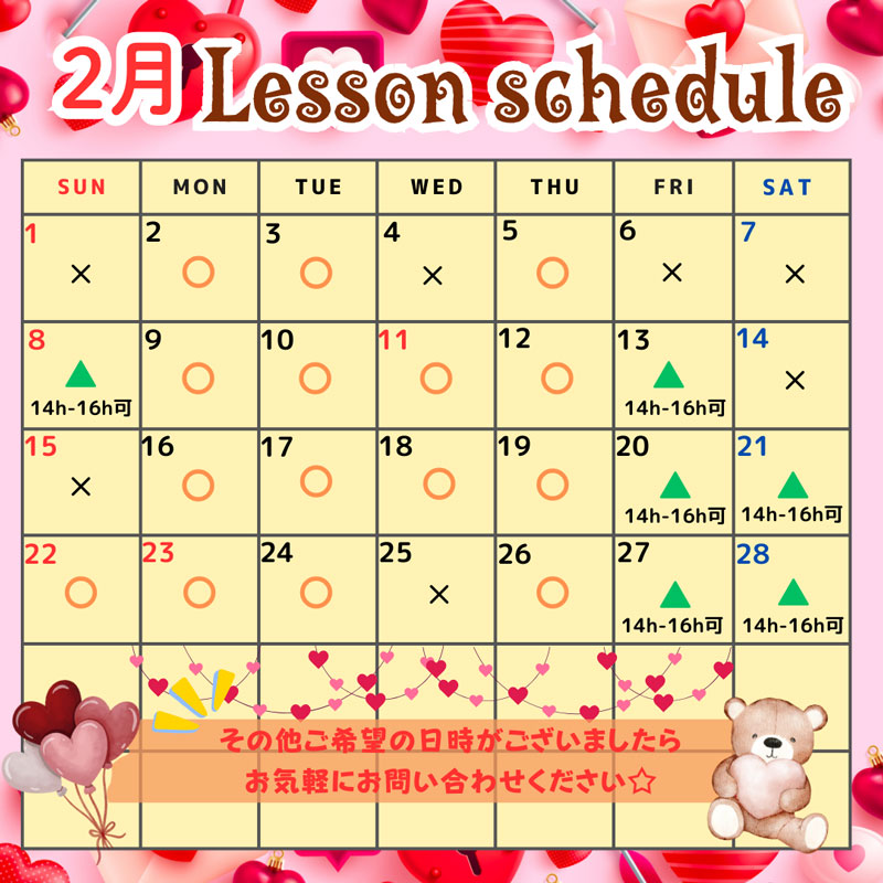 さて、2月のレッスンスケジュールをお知らせいたします!